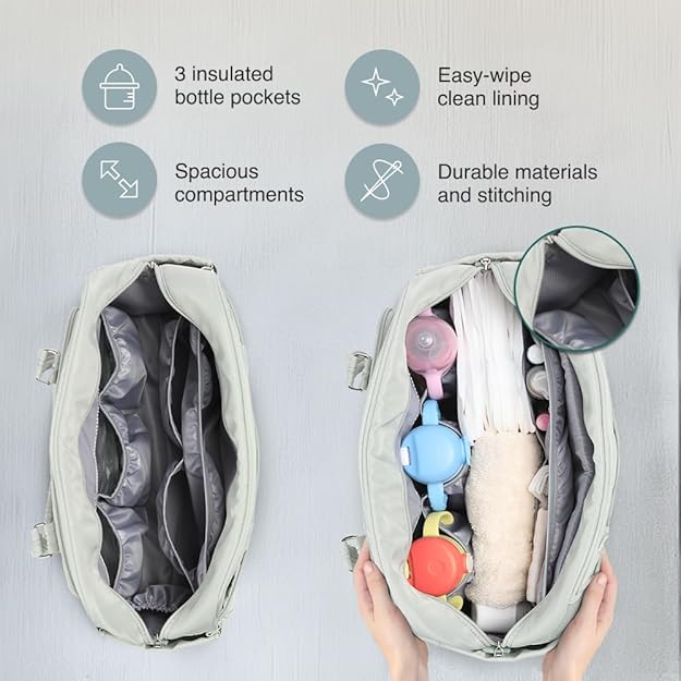 - Erdvus ir gerai sukonstruotas – 1 pagrindinis skyrius ir 14 funkcinių kišenių, taip pat 3 izoliuotos kišenės užtikrina, kad jūsų būtiniausi daiktai būtų tvarkingi ir nereikėtų knaisiotis. Šiame plačiame vystymo krepšyje galima susidėti visus būtiniausius kūdikio daiktus. Viskas – nuo kūdikio drabužių iki užkandžių – jame tvarkingai sudėta ir lengvai pasiekiama, įskaitant raktų pakabuką, kad raktai būtų po ranka.