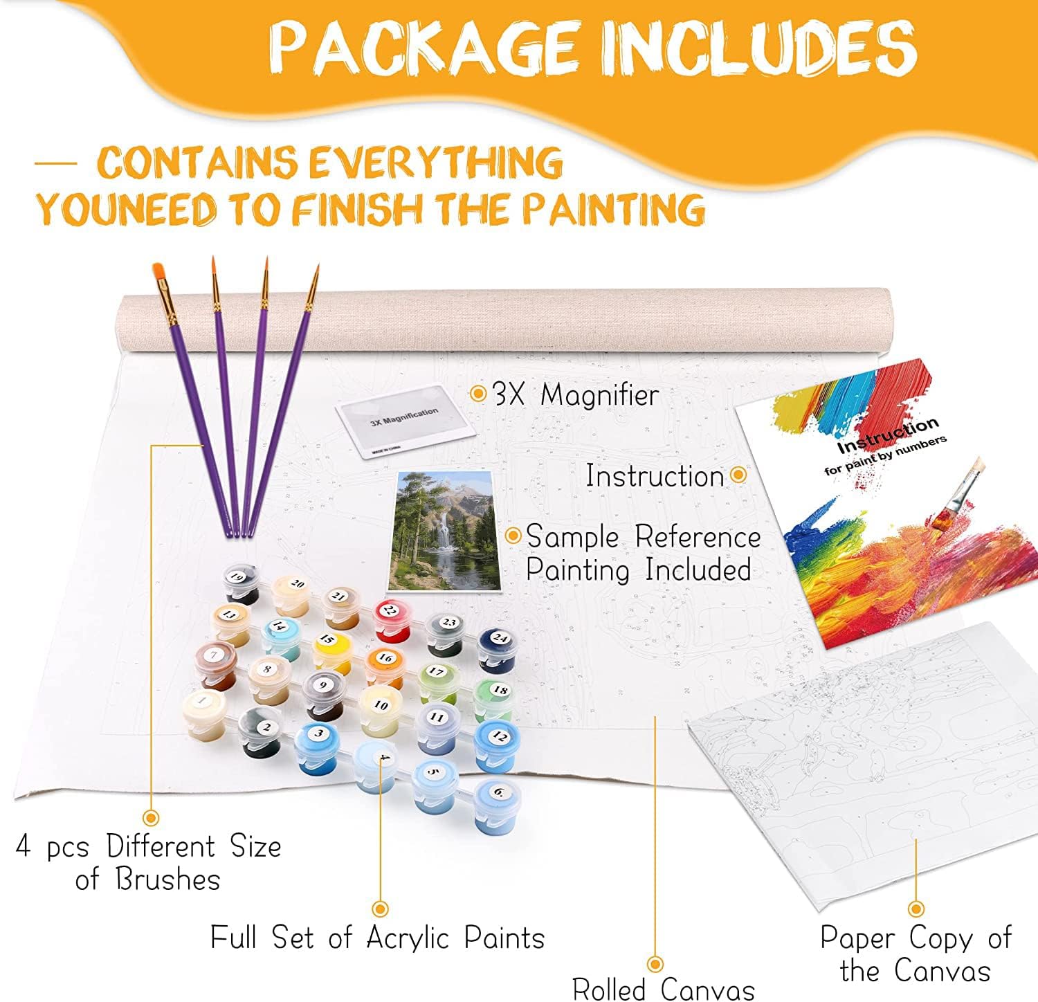 - ATNAUJINTI TEPINTUKAI IR DROBĖ – Mūsų tapybos pagal skaičius rinkinyje suaugusiems yra 4 skirtingų dydžių, labai atsparūs nailono teptukai, kurie padės jums lengviau tapyti. Taip pat siūlome susuktą drobę, kad išvengtumėte raukšlių ir jūsų paveikslai būtų gražesni.
